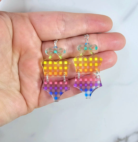 Rainbow Checkered Bathing Suit Earrings, Checkered Swimsuit Earrings, Beach Earrings, Vacation Earrings, Gift for Her, Pride Earrings